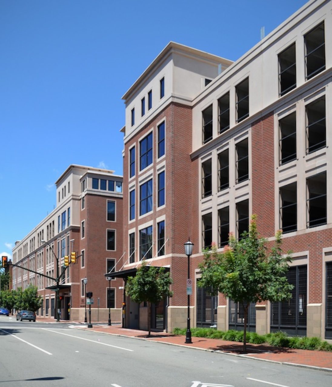 Several blocks to the west is the just-completed parking deck at the intersection of Laurel and West Grace streets, by WDG Architects of Washington, D.C. (Figure 19) The design and massing of the structure is meant to complement a new student housing building at the opposite end of the block. As with the preceding Grace Street decks, definition is given to the design with corner elevator towers topped with pyramidal roofs. The top level is shielded by a parapet with lighting kept discreetly out of sight. The dense concentration of student activity in the area justified accommodating retail and other services in the street level.