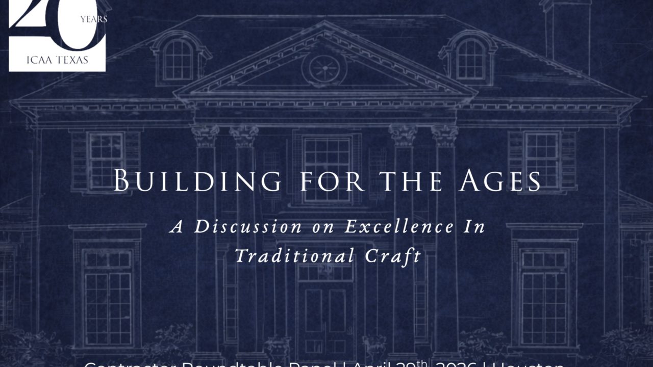 Join the ICAA Texas Chapter for an exclusive panel discussion featuring Houston's leading contractors as they explore the evolving craft of building new traditional in a modern world. This conversation will examine the intersection of enduring design principles and contemporary construction, offering insight into how classical aesthetics and innovation are shaping today's built environment. Join us for networking, drinks, and light bites at 5:30 PM. Panel Discussion begins at 6:15 PM.